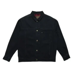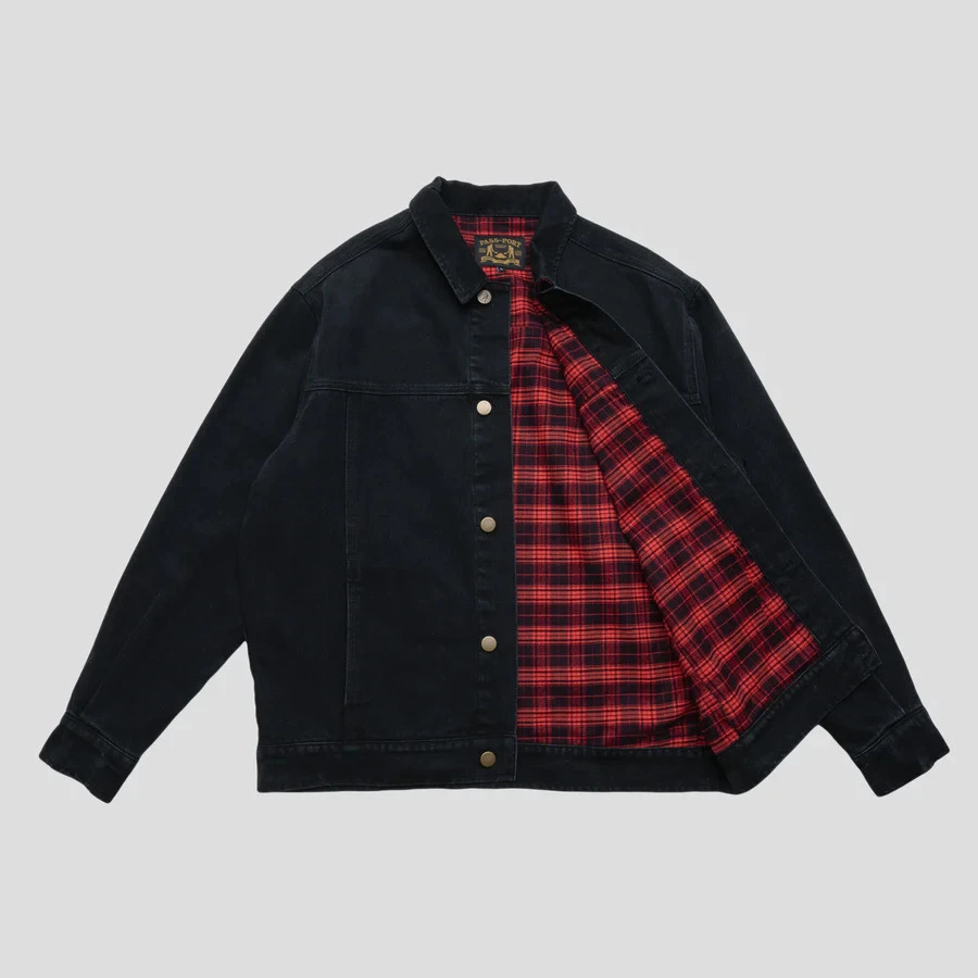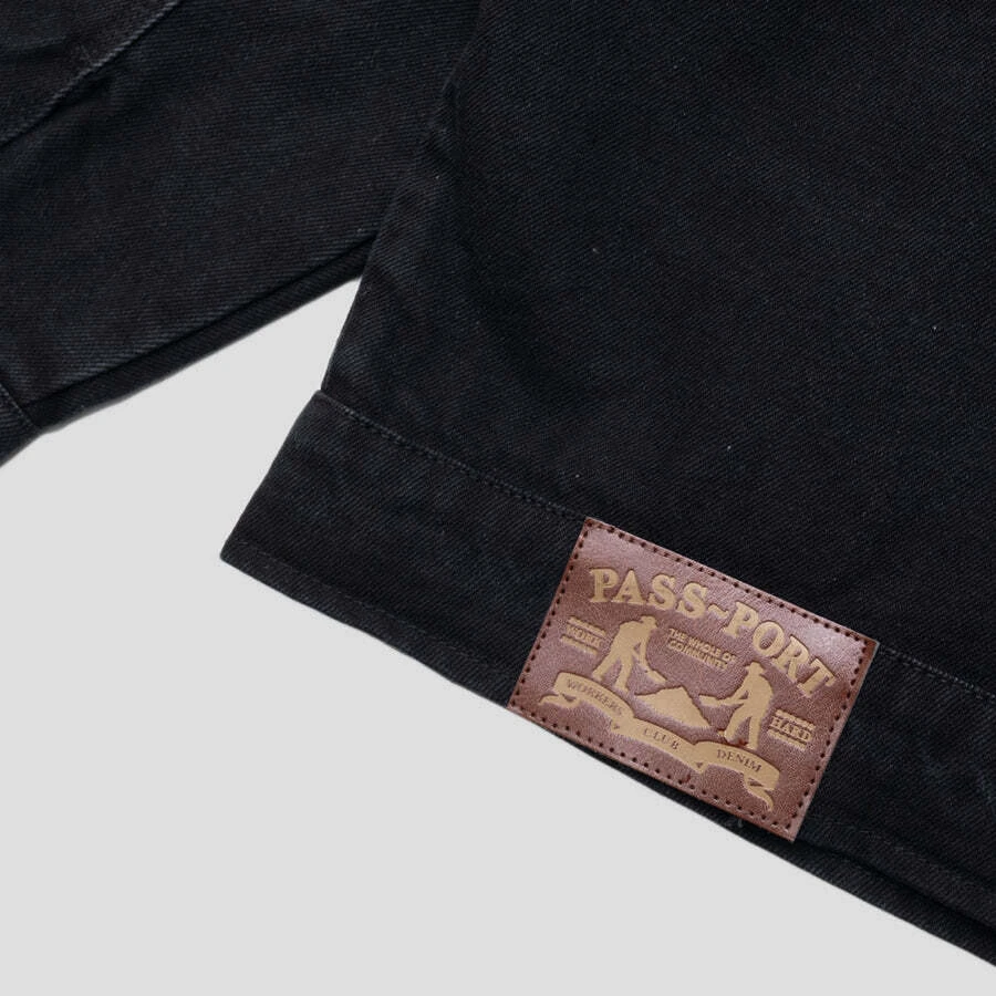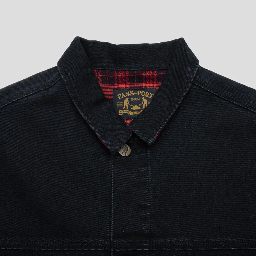 Pass~Port Workers Club lined denim jacket in black from range #39. Made from 100% Cotton 16oz Rigid Denim and fine yarn for extra strength. The jacket features flannel lining on the inside and under the collar.