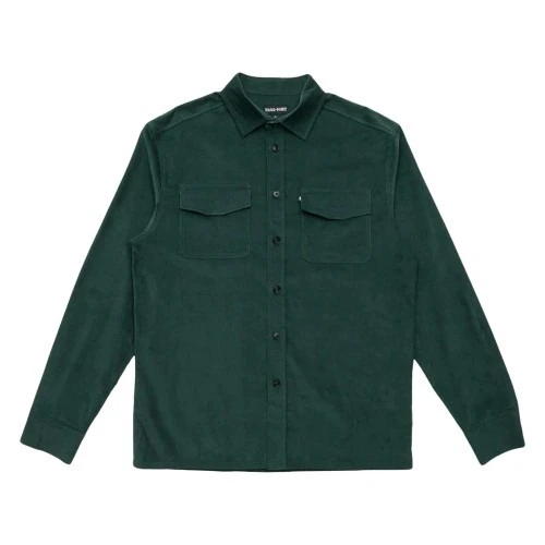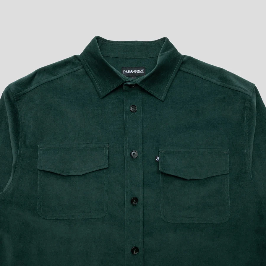 Pass~Port Micro Cord Workers shirt in forest green from range #39. Made from 100% cotton with recycled buttons and double pocket on front. Pass~Port source 100% recycled buttons for all products utilising materials to be repurposed.