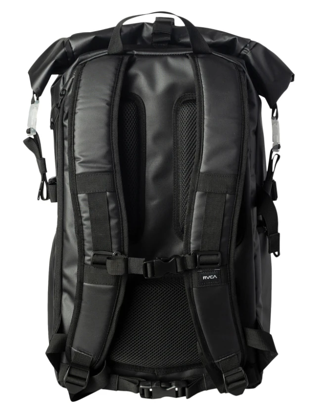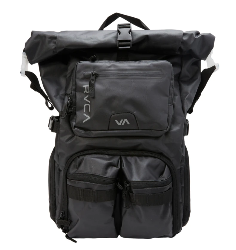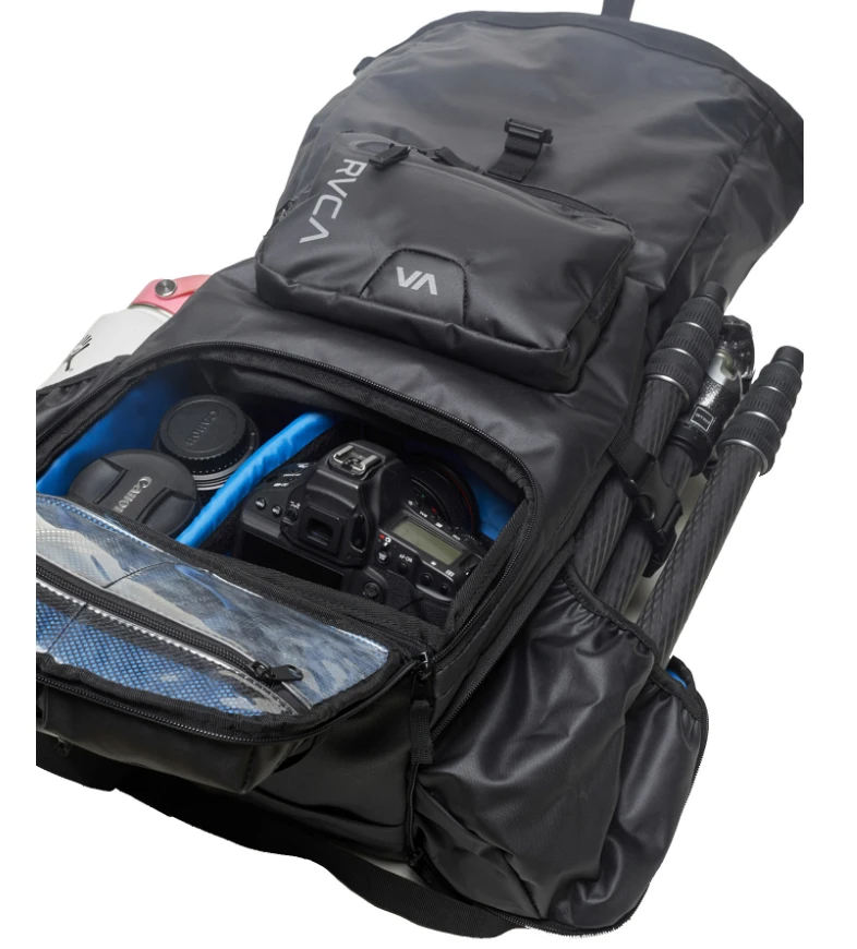 Combining function, style, and comfort, the RVCA Zak Noyle Backpack is made from water repellent 400D sleek fabric with a concealed rain cover and ergonomic shoulder straps so you’re never weighed down or wet. Featuring a removable camera compartment and interior dividers for ultimate organization on the go, this versatile backpack is designed with a roll top entry, mesh padded rear panel, and an abrasion-resistant base, so your belongings stay safe and dry. Made for the off-duty photographer, the side water bottle pocket also fits a standard tripod. And the exterior laptop sleeve, concealed passport compartment, and fleece-lined eyeglass holder make this a traveling staple.