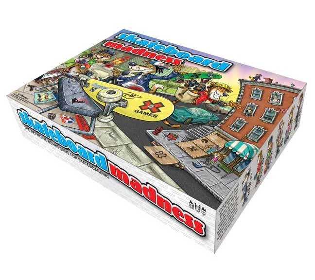 Skateboard Madness Board Game Skateboard Madness is the definitive and ultimate board game of skateboarding that plays 2-6 players. Come and ride with the Madness Crew as they make their way around the game board. The object of the game is to win the X Games Championship in skateboarding, while meeting the four Madness professional skateboarders; Andy MacDonald, Corey Duffel, Tony Mag and Ron Allen. Also, collect sponsorship cards from the official Madness sponsors. Along the way, you’ll encounter an extensive trivia section, random madness and lots of fun for the whole family. Fans of Skateboarding will appreciate the authenticity while everyone else will grasp the user friendly mechanics. Game contains, Playing Board, 6 Madness Characters & Stands, Trick Card Deck, Trivia Deck, Pros & Legend Cards, Random Card Deck, Style Point Tokens, Bandage Tokens, 4 Red Dice, 2 Black Dice, 1 Chance Dice, 6 Play Reference Cards & Play Guide. Ages 8+