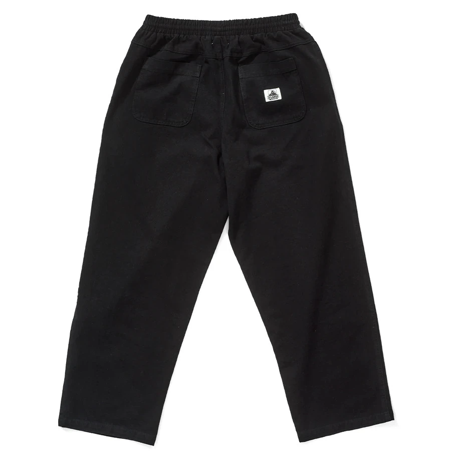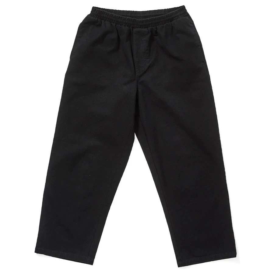 The 91 Pant in Black is a elasticated wide-fit pant in a heavyweight cotton canvas. They feature side pocket entry and dual rear pockets, stitched mock fly and woven label at left rear pocket. Made from 100% Heavyweight Cotton Canvas.